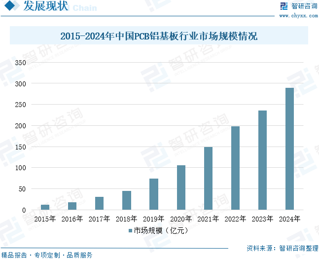 近年来,随着中国电子工业的快速发展,PCB铝基板市场呈现出稳步增长的趋势。特别是在LED照明、电源模块、汽车电子等领域的快速发展,为PCB铝基板市场提供了广阔的市场空间。同时,随着电子产品的小型化和高功率化趋势,对PCB铝基板提出了更高的要求,促进了产品技术的不断升级和更新换代。数据显示,2023年中国PCB铝基板市场规模为235.19亿元,预计2024年中国铝基板市场规模将增长至289.26亿元。未来几年内,随着LED照明、电源模块、汽车电子等领域的快速发展以及5G通信、智能家居等新兴领域的崛起,PCB铝基板市场将继续保持增长态势。特别是在高导热性、低热阻、高可靠性等方面的产品将受到市场的青睐。