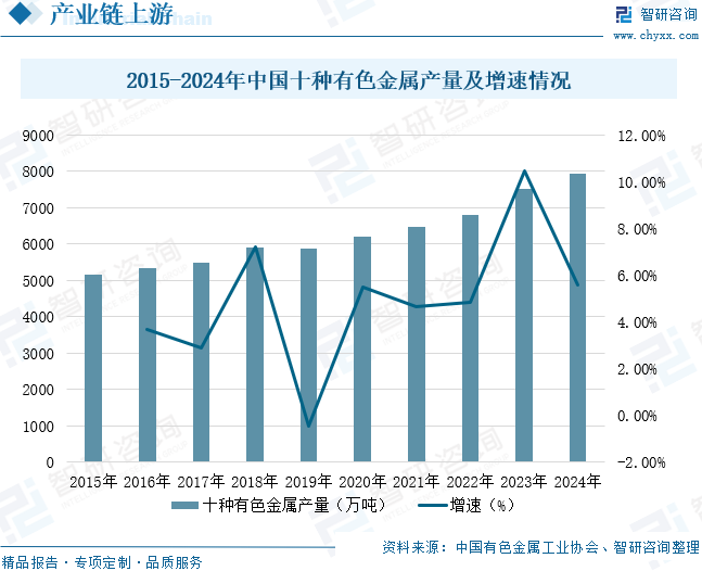 近十年来,我国有色金属行业产量逐年稳定增长。数据显示,2024年我国规模以上有色金属企业工业增加值同比增长8.9%,十种有色金属总产量达到7919万吨,同比增长4.3%。其中,铝作为有色金属的重要组成部分,凭借其优异的性能,在多个领域发挥着不可替代的作用,尤其是在PCB铝基板制造中,铝作为主要基材,成为高散热、高功率电子设备的理想选择。因此,我国有色金属行业的稳步增长为PCB铝基板的发展提供了坚实的原材料保障。