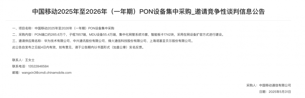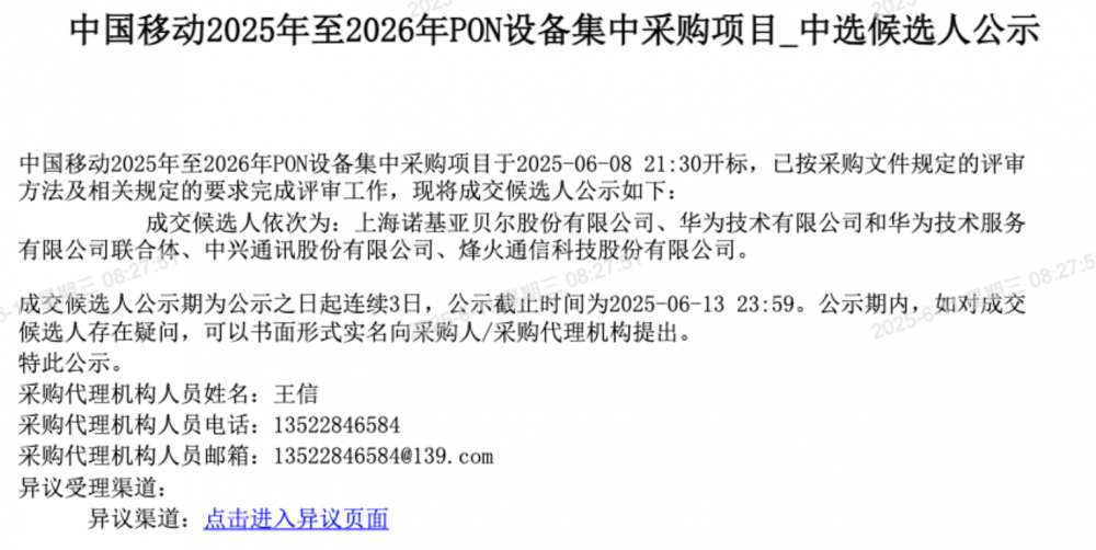 C114讯 6月10日消息(九九)中国移动采购与招标网日前发布2025年至2026年PON设备集中采购项目中选候选人公示优益配优益配优益配,成交候选人依次为:上海诺基亚贝尔股份有限公司、华为技术有限公司和华为技术服务有限公司联合体、中兴通讯股份有限公司、烽火通信科技股份有限公司。
